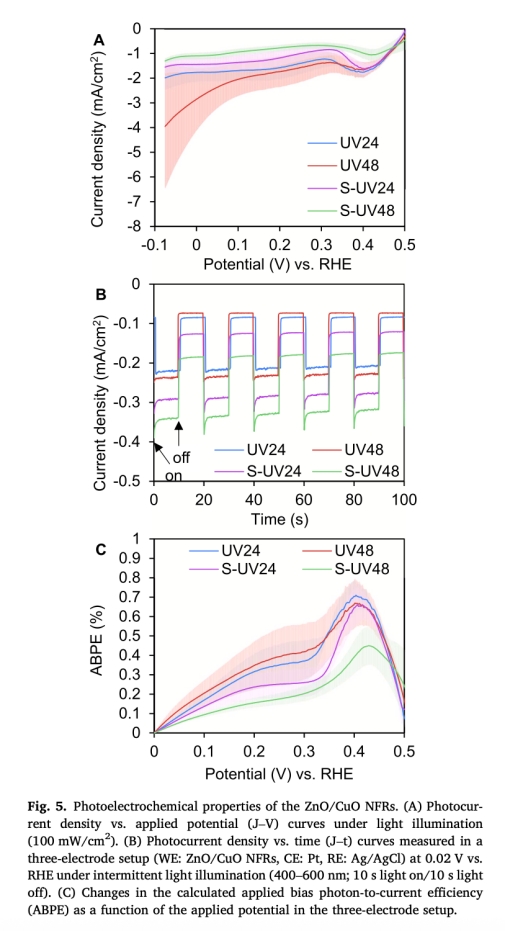 意義:證實G-SPSC法制備的ZnO/CuO NFRs具有優(yōu)異的光電轉(zhuǎn)換能力,省略濺射步驟仍保持高性能,為綠色合成提供新策略。