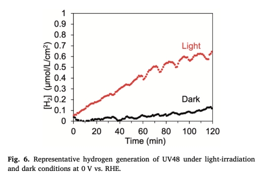 數(shù)據(jù):UV48產(chǎn)氫速率0.63 μmol/cm2/天(0 V vs. RHE),法拉第效率0.09-0.41%(0 V) vs. 48.1-77.6%(-0.69 V)。