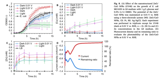 數(shù)據(jù):無電位時Cu2?溶出0.38-0.47 mM(抑制大腸桿菌生長54-58%);維持0.01 V vs. RHE電位可完全抑制Cu2?溶出。