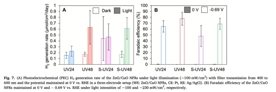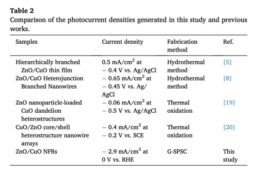 G-SPSC法制備的ZnO/CuO NFRs(UV48)光電流密度達-2.9 mA/cm2,比文獻值高3倍,且無需濺射種子層。