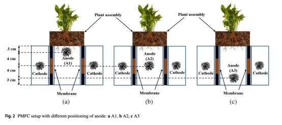 陽(yáng)極位置:三組PMFC陽(yáng)極分別置于3 cm(A1)、7 cm(A2)、11 cm(A3)深度(圖2, 圖7)。
