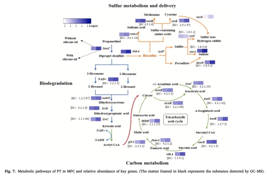 數(shù)據(jù):硅油表面富集Hyphomicrobium(硫醚降解菌,豐度從0.05%升至1.36%),陽(yáng)極生物膜中Pseudomonas(PT降解菌)豐度從32.1%增至41.2%。KEGG顯示硫代謝(soxC基因)、能量合成(sdhA、fumA基因)顯著上調(diào)。