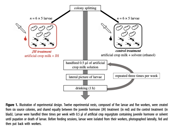 實驗設計:從6個蟻群中創建12個實驗小群(每群含5只幼蟲和5只工蟻),隨機分為JH處理組(人工反芻液含JH III)和對照組(僅溶劑)。