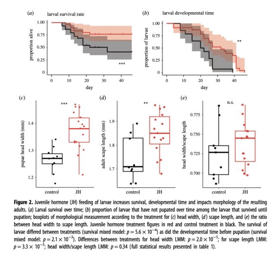 核心機制:口服JH通過延長幼蟲發育時間,增加其累積營養的機會,最終增大成蟲體型。