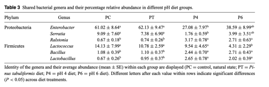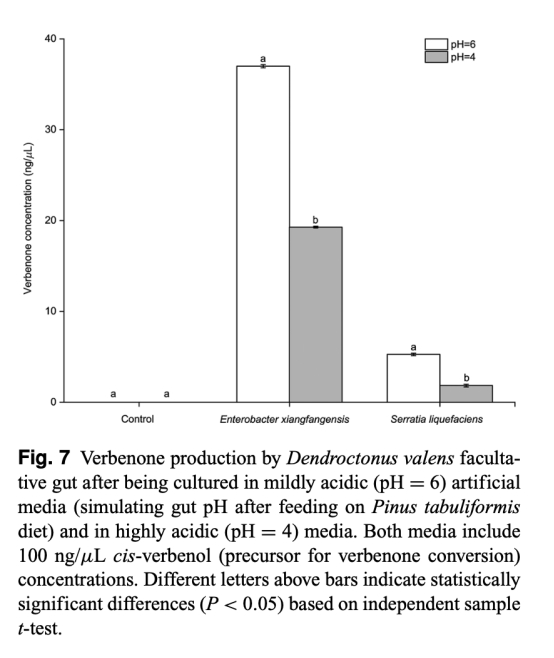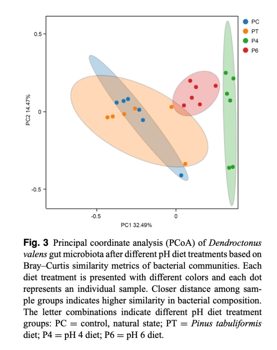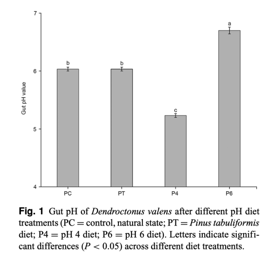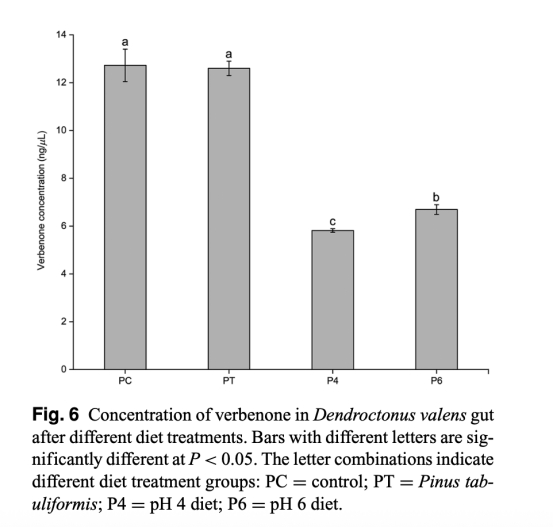 研究探究了不同pH飲食(自然狀態(tài)油松樹皮pH 4.7、弱酸性pH 6、強酸性pH 4)對紅脂大小蠹(Dendroctonus valens)腸道pH、菌群組成及聚集信息素馬鞭草酮(verbenone)產(chǎn)量的影響。結(jié)果表明: