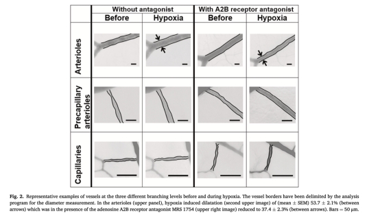 數(shù)據(jù):缺氧時(shí)小動(dòng)脈擴(kuò)張53.7±2.1%,前毛細(xì)血管小動(dòng)脈擴(kuò)張約40%,毛細(xì)血管擴(kuò)張顯著更低(未量化具體值)。