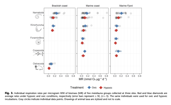 生物量特異性呼吸速率(MR):上述主要類群(線蟲、動吻動物、有孔蟲、橈足類、介形蟲)在常氧和低氧條件下單位生物量的呼吸速率(單位:nmol O2 μg?1 d?1)。(數據點主要來自圖3)。