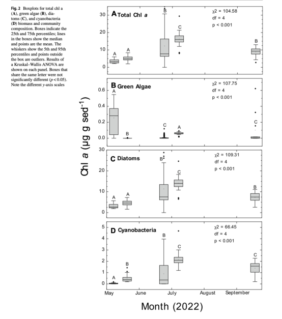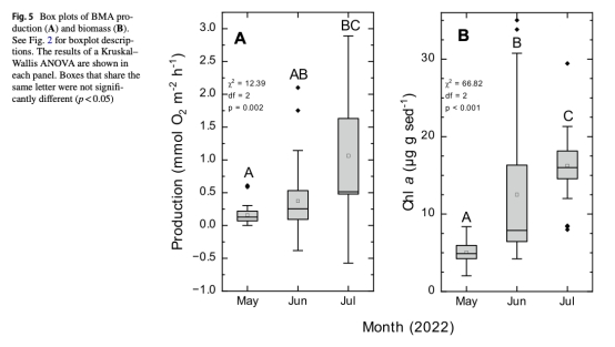 數(shù)據(jù):攝食球與未攝食沉積物的葉綠素a無差異(p=0.15),但不同月份生物量差異顯著(p<0.001)。