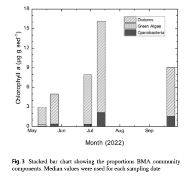 BMA動態(tài):BMA生物量(葉綠素a)在6-7月達峰值(16 μg chl a g?1沉積物),群落以底棲硅藻為主(>80%),藍藻次之(圖2, 圖3)。