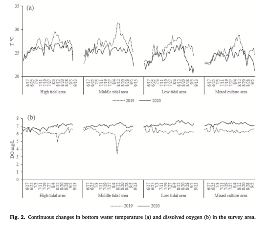 數(shù)據(jù):2019年8月中潮區(qū)持續(xù)高溫(>30°C)、低氧(DO最低3.35 mg/L);2020年無異常。