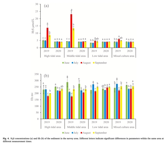 密度效應:高養(yǎng)殖密度(中潮區(qū))加劇有機污染,促進低氧/H?S生成,增加死亡風險(表1顯示中潮區(qū)OC與H?S正相關)。