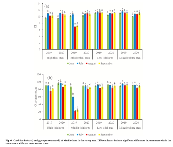死亡主因:高溫、低氧與H?S的協(xié)同脅迫(非單一因素超標)導致蛤仔能量耗竭(糖原銳減)和生理崩潰(CI下降),2019年中潮區(qū)三重脅迫疊加引發(fā)80%死亡率(圖5, 圖7)。