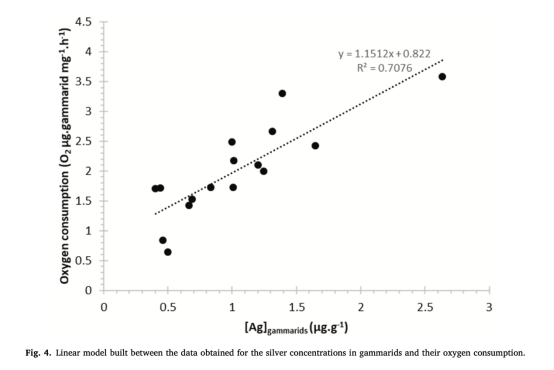 數據:10 nm nAg(5 μg/L)使耗氧率增加47%,且與體內銀濃度顯著正相關(R2=0.82, 圖4)。