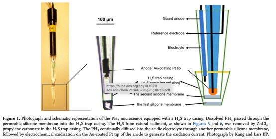 研究開發(fā)了一種高選擇性電流型磷化氫(PH?)微傳感器,用于原位監(jiān)測水體和沉積物中的痕量PH?(檢測限2 nmol·L?1)。傳感器采用金鍍鉑(Au-Pt)工作電極和前置H?S捕獲裝置(ZnCl?-碳酸丙烯酯),通過雙層硅膜實現(xiàn)氣體選擇性滲透。PH?在酸性電解液中被電化學氧化為H?PO?,產(chǎn)生的電流與PH?濃度線性相關(0–1200 nmol·L?1)。該傳感器成功應用于海洋沉積物剖面,在13 mm深度處檢測到PH?富集(100 μmol·L?1)。