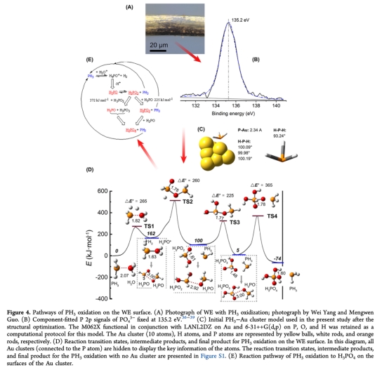 PH?在Au表面經(jīng)H?PO中間體分步氧化為H?PO?,量子計算證實能壘降低(265→225 kJ·mol?1)。