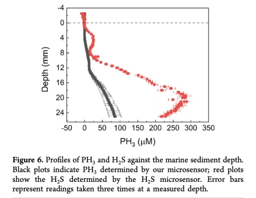 沉積物剖面數(shù)據(jù)(圖6)揭示PH?在13 mm深度突增(100 μmol·L?1),結(jié)合H?S分布驗證傳感器在硫-磷耦合循環(huán)研究中的實用性,填補傳統(tǒng)破壞性采樣(如提取法)的空間分辨率缺陷。