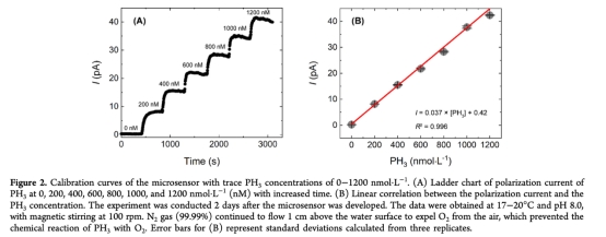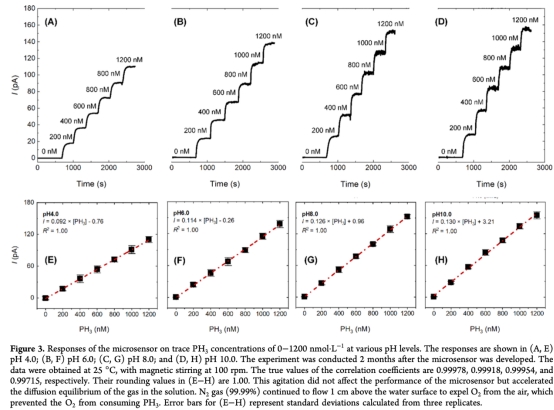 pA級電流分辨率(圖2A)實現(xiàn)nmol·L?1級PH?定量,克服傳統(tǒng)方法(如氣相色譜)無法原位監(jiān)測的局限。