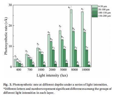 深層光合潛力:強(qiáng)光(5000 lx)可激活深層微藻(100–200 μm)光合活性,速率提升最高956%(圖3b)。