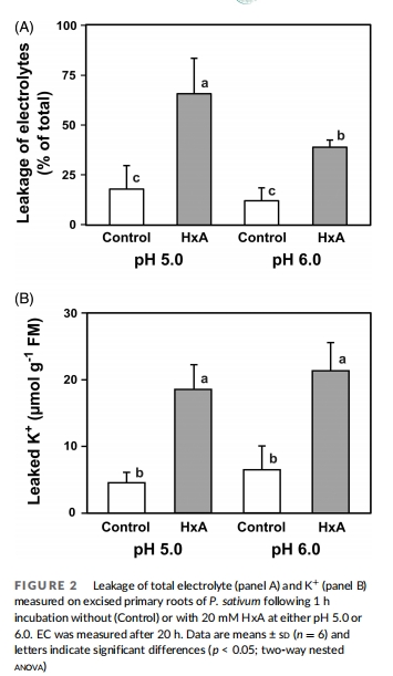 揭示HxA對根系呼吸的劑量-效應關系(圖1A),明確pH 5.0下EC??=7.2 mM,為毒性閾值提供依據。