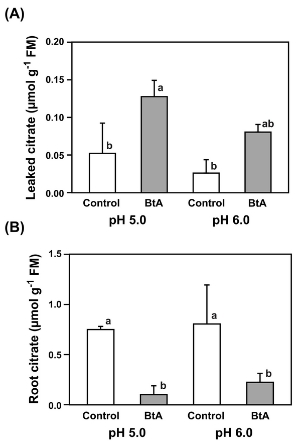 豌豆根在pH 5.0/6.0下暴露于20 mM HxA或BtA 1小時(圖1)。