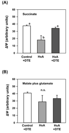 線粒體功能 圖6 分離線粒體膜電位(△Ψ)和耗氧率僅輕微下降(圖6),排除HxA直接毒性。