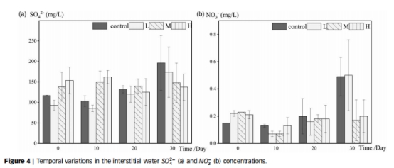 數(shù)據(jù):SO?2?濃度波動(dòng)(電壓抑制硫酸鹽還原),NO??濃度在低氧組(M/H)↓(因硝酸鹽還原增強(qiáng))。