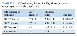 數據:10g樣本的ASV豐富度(GF71站:117±5)顯著高于0.5g樣本(28±19)。