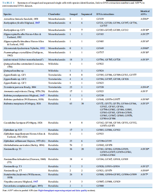 數據:0.5g樣本中 Ammonia confertitesta(ASV1*)占比83%,而10g樣本以單室有孔蟲(Monothalamids)為主(平均58%)。