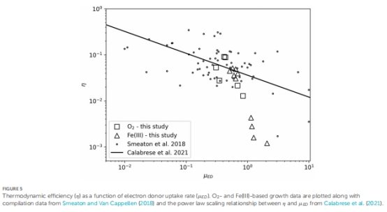 能量分配:Fe(III)還原在>30°C時,維持能(NGAM)顯著增加,導致生長效率下降(圖3C)。
