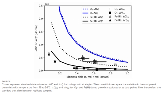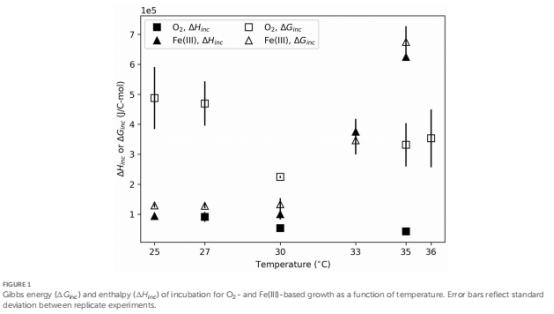 通過量熱法(isothermal calorimetry)和培養(yǎng)基化學分析,量化了O?/Fe(III)還原耦合乳酸氧化的生物能量學參數(shù)(ΔG, ΔH)。