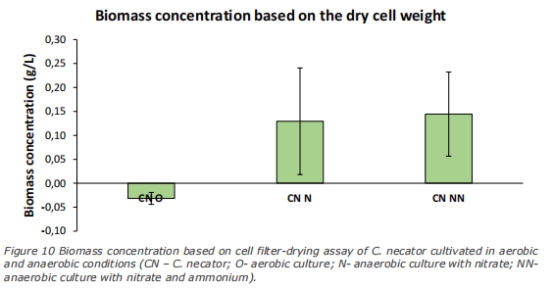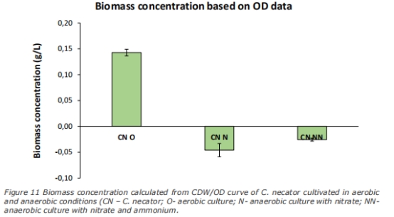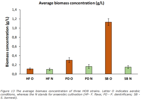生物量濃度 圖10、11、13 評估菌株生長效率。S. barnesii有氧培養生物量最高(1.3 g/L),無氧培養普遍低下(<0.16 g/L)。