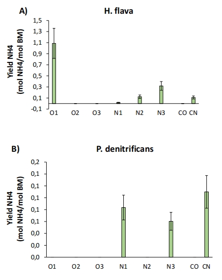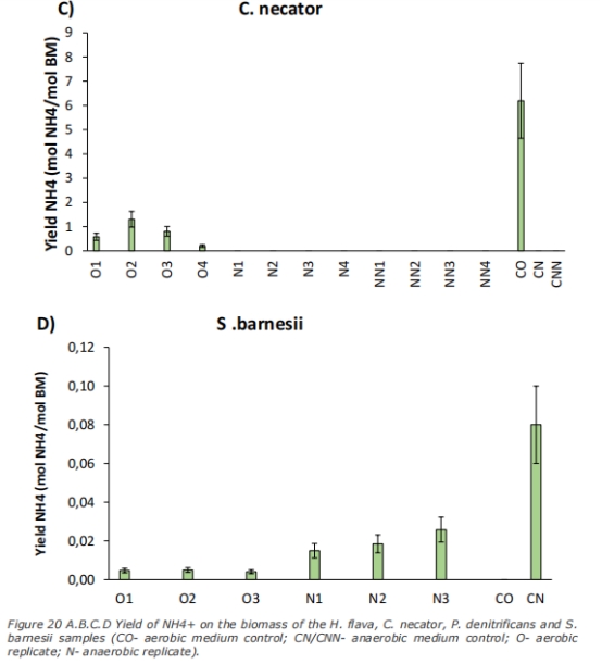 硝酸鹽/銨產率 圖19(YNO3/X)、圖20(YNH4/X) 量化無氧呼吸效率及氮同化能力。數據離散大(如H. flava YNO3/X 0.49–3.02 mol/mol),可靠性低。
