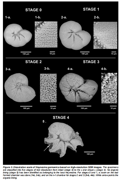殼體溶解分級(SEM) 圖2-3, 6 建立6級溶解標準(DS-0至DS-5),揭示酸化導致殼體從剝落到完全溶解的連續過程。