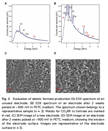 電極表面元素分析 圖2A-B Fe/Co等金屬電沉積促進非生物CO?還原