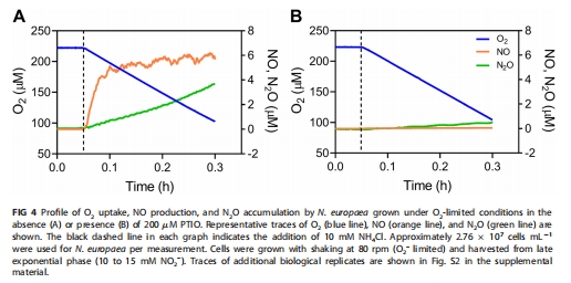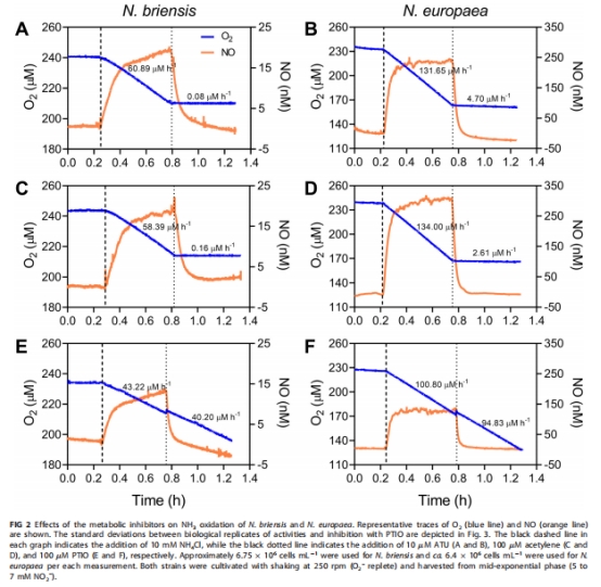本研究通過電化學傳感器和溫和NO清除劑PTIO,探究了NO在模型氨氧化細菌(AOB)Nitrosomonas europaea中的代謝作用。核心發現: