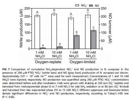 氧限制條件:NO產量高達NO??產量的43.5%-54.4%(游離中間產物)(圖4, 圖7)。