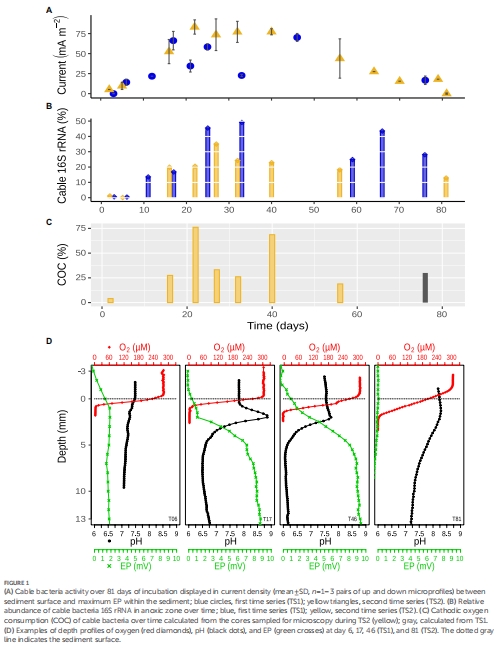 電子傳遞機制:集群細菌可能通過電子穿梭體向電纜細菌傳遞電子(如氧化硫化物),利用其作為“生物電纜”間接耗氧(圖1C)。
