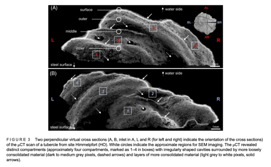 結構解析:顯微CT(圖3)和掃描電鏡(圖4-5)揭示銹瘤多層結構與微生物分布