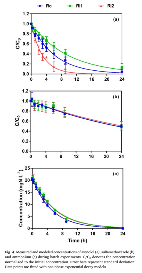 TOrCs去除選擇性:高頻間歇曝氣(Ri2)顯著提升阿替洛爾去除率(kbio提高109%),磺胺甲惡唑不受影響,異養(yǎng)菌主導(dǎo)降解。