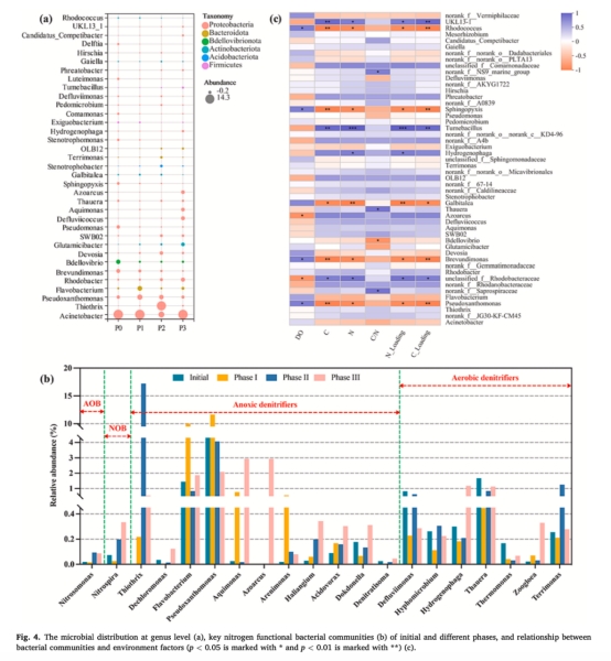 微生物群落數據:包括優勢菌門(如Proteobacteria)及關鍵氮功能菌(如Thiothrix、Hydrogenophaga)豐度。來源:圖4a-b。研究意義:揭示SND的微生物機制(如缺氧反硝化菌富集至23.48%),并關聯環境因子(如DO與Pseudoxanthomonas正相關),解釋系統在好氧條件下實現反硝化的原因。