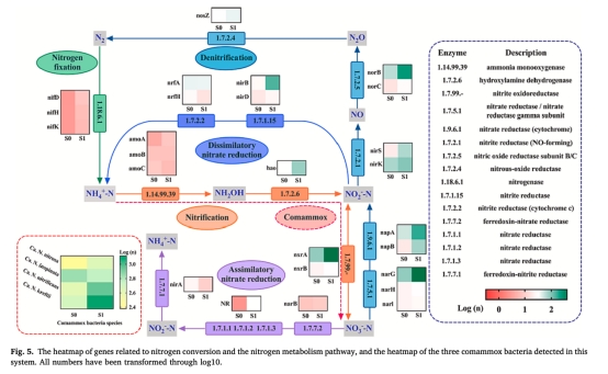 氮代謝途徑數據:包括氮轉化基因(如amoABC、nirSK)和comammox菌(如Ca. N. nitrosa)豐度。來源:圖5。研究意義:通過宏基因組分析確認反硝化為主導途徑(基因豐度高于初始兩倍),并發現comammox菌貢獻硝化效率,為SND的整合機制提供分子證據。