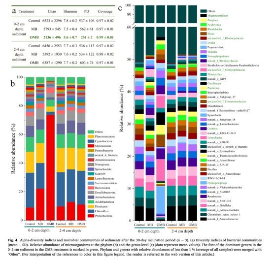 N?O分布(圖3b):OMB組沉積物N?O積累最低,反映好氧反硝化減少溫室氣體排放。