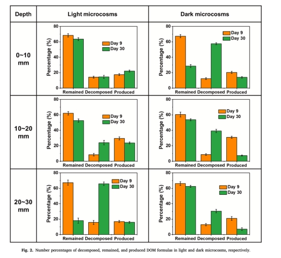 數據:光照組DOM分解率<16%(黑暗組>30.4%),表層(0-10 mm)CHO化合物增加34%。