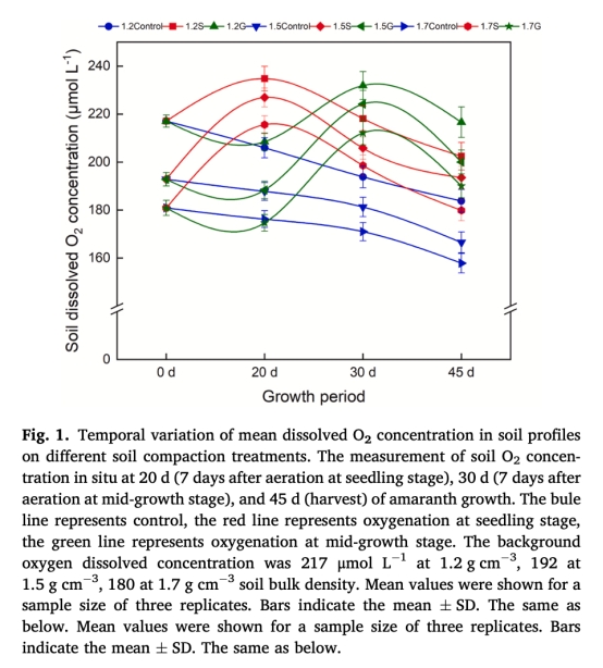 土壤氧氣動態:增氧(尤其生長期)顯著提升土壤溶解氧濃度17.9-20.4%(圖1),緩解板結脅迫。
