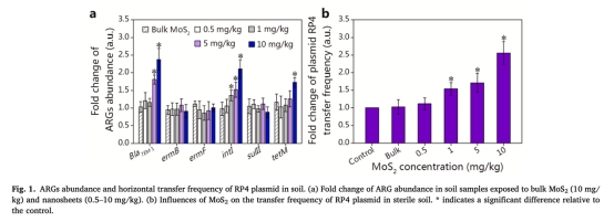 研究揭示了二硫化鉬(MoS?)納米片通過促進細菌間質粒水平轉移,增加土壤中抗生素抗性基因(ARGs)的豐度。關鍵發現包括: