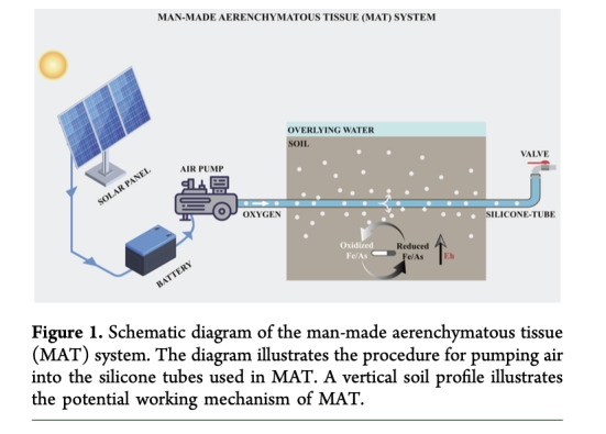 研究提出一種新型人造通氣組織(MAT),通過硅膠管模擬濕地植物根系釋放氧氣,持續(xù)提升稻田土壤氧化還原電位(Eh),從而降低砷(As)的生物有效性。MAT使土壤Eh從-119 mV升至-80.7 mV(提升約30%),有效半徑達5 cm,持續(xù)作用約100天。其作用機制包括: