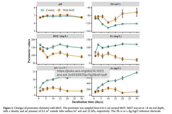 數(shù)據(jù):MAT使0-2 cm土壤Eh從-119 mV升至-87.3 mV(提升26.9%),孔隙水As濃度降低62.2%。