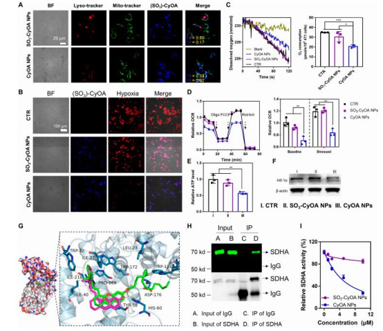 缺氧逆轉(zhuǎn):證實(shí)CyOA靶向SDHA抑制OXPHOS,降低氧氣消耗(圖3C-E);