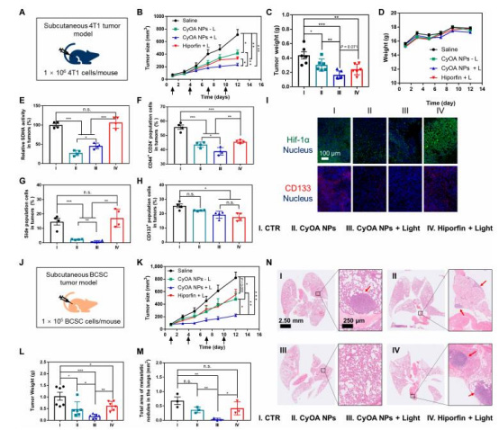 CyOA NPs+L組在4T1模型中抑瘤率67%(Hiporfin組53%),肺轉(zhuǎn)移結(jié)節(jié)減少(圖5B-C, M-N);