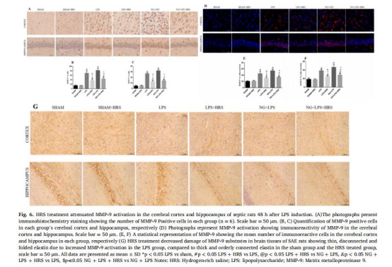 MMP-9活性:LPS組皮質區MMP-9陽性細胞69.60±10.85%,HRS組降至36.20±7.66%(圖6B)。